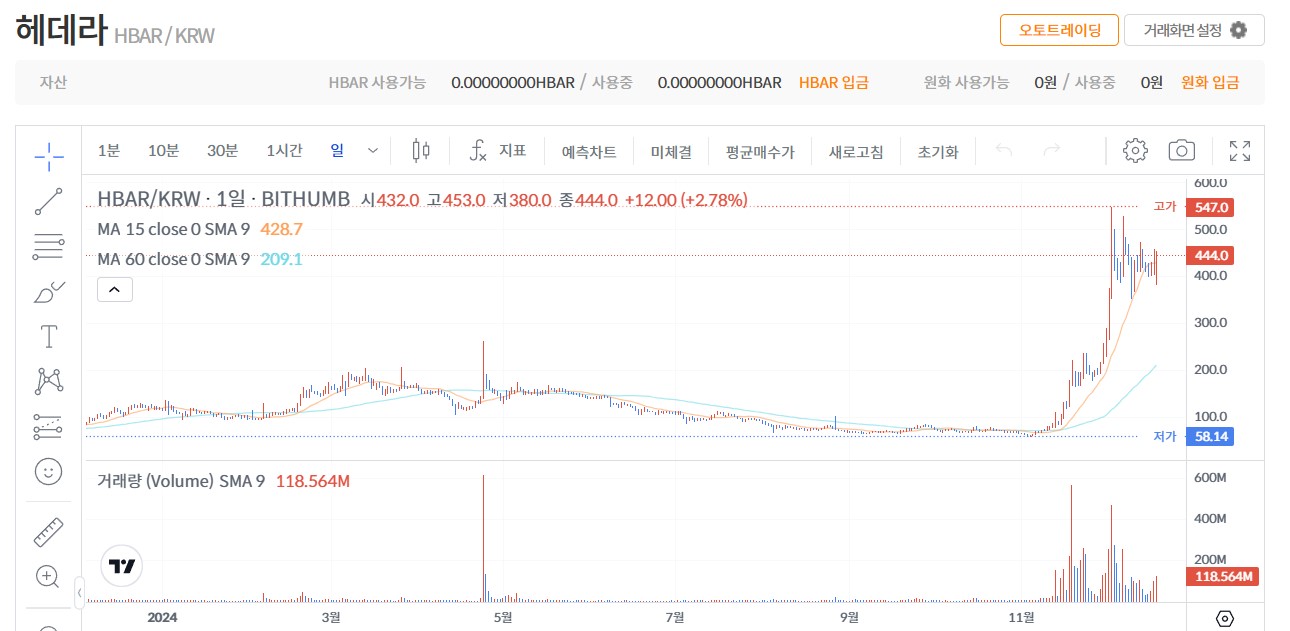 2024년 12월 19일 현재 헤데라 코인의 가격은 약 444원에 거래되고 있습니다.